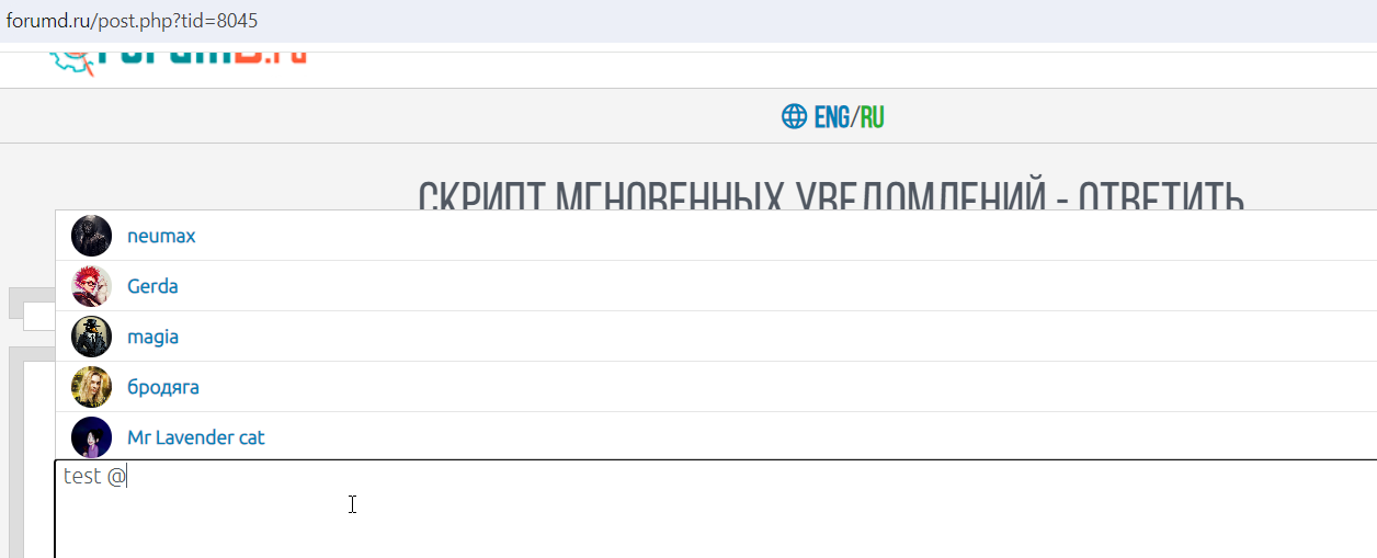 Это дополнение позволяет участникам упоминать пользователей в темах форума, написав в сообщении их ник(и), начинающиеся с @.